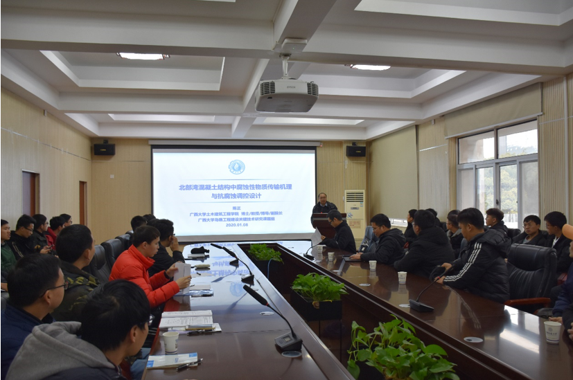 陈正教授首先以《北部湾混凝土结构中腐蚀性物质传输机理与抗腐蚀调控设计》为题,详细阐述了混凝土中硫酸盐侵蚀过程分析与服役寿命预测方法,并介绍了基于第一性原理的水氧共同作用下钢筋腐蚀的机理。随后,陈正教授以《高原环境下钢管混凝土拱桥管内混凝土制备、顶升及检测关键技术》为题,基于世界最大跨度铁路钢管混凝土拱桥——川藏铁路跨雅鲁藏布江藏木特大桥,介绍了高原环境下混凝土体积变化过程及相应的钢管混凝土拱桥管内混凝土顶升关键技术,并阐述了超声波在高原钢管混凝土中的传播路径和传播规律,以及相应的管内混凝土密实性检测关键技术。报告后,陈正教授与在场师生进行了广泛互动和积极交流。