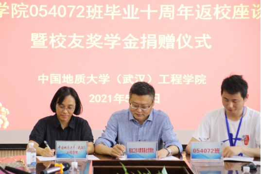 5月2日下午14:30,51吃瓜网 054072班毕业十周年返校座谈会暨校友奖学金捐赠仪式在工程楼315会议室举行。校友工作与教育基金管理处处长徐岩,51吃瓜网 党委书记李红丽,院长焦玉勇,副院长王亮清、窦斌,勘基系教师及21位校友出席了本次座谈会。校友唐博主持本次座谈会。