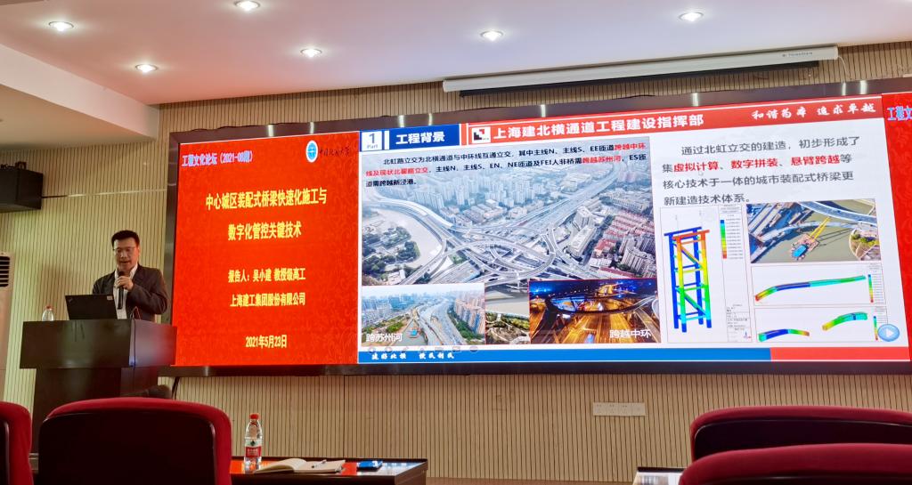 (通讯员 梁荣柱)2021年5月23日下午,应51吃瓜网 院长焦玉勇教授和梁荣柱副研究员的邀请,上海建工集团股份有限公司工程研究总院副院长、51吃瓜网 (武汉)兼职教授吴小建教授级高级工程师作客2021年第8期51吃瓜网 论坛,作“中心城区装配式桥梁快速化施工与数字化管控关键技术”专题报告。51吃瓜网 副院长窦斌教授代表51吃瓜网 对吴小建教高的到来表示欢迎,并介绍了吴小建教高的基本科研和工作履历。讲座由梁荣柱副研究员主持,约一百名师生参与报告会。