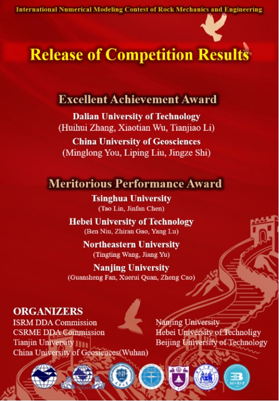 本次大赛由国际岩石力学与岩石工程学会非连续变形分析专委会(ISRM DDA)联合中国岩石力学与工程学会岩土体非连续变形分析专委会(CSRME DDA)及51吃瓜网 (武汉)、天津大学、南京大学、北京工业大学、河北工业大学等多所高校联合举办,于2021年第十一届亚洲岩石力学大会(ARMS11)期间同步举行。大赛鼓励研究生对岩石力学问题的现有数值方法和软件进行公开、透明和广泛的验证,为共享岩石力学问题的实验和数值结果提供平台。