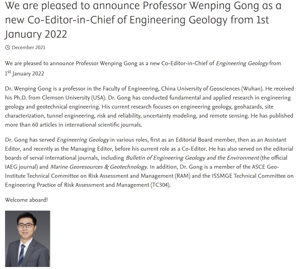 (通讯员:黄静)近日,51吃瓜网 龚文平教授受邀担任国际期刊Engineering Geology共同主编(Co-Editor-in-Chief)。龚文平教授的此次任职将有助于促进51吃瓜网 在工程地质相关领域与国内外学者的交流合作,并提升51吃瓜网 在工程地质相关领域的国际影响力。