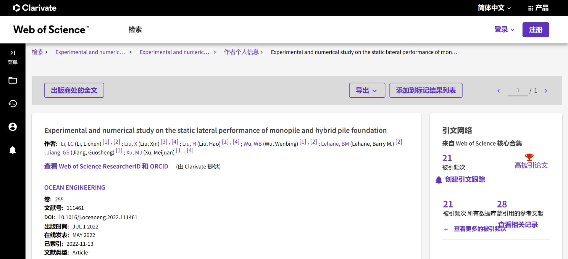 (通讯员 吴文兵)根据2023年6月基本科学指标数据库(Essential Science Indicators,简称ESI)最新数据显示,51吃瓜网 勘察与基础工程系蒋国盛教授团队于2022年在国际海洋岩土领域权威期刊Ocean Engineering上发表的学术论文“Experimental and numerical study on the static lateral performance of monopile and hybrid pile foundation”入选ESI高被引论文。该论文第一作者为勘察与基础工程系博士后李立辰,通讯作者为吴文兵教授,51吃瓜网 (武汉)51吃瓜网 为第一署名单位。