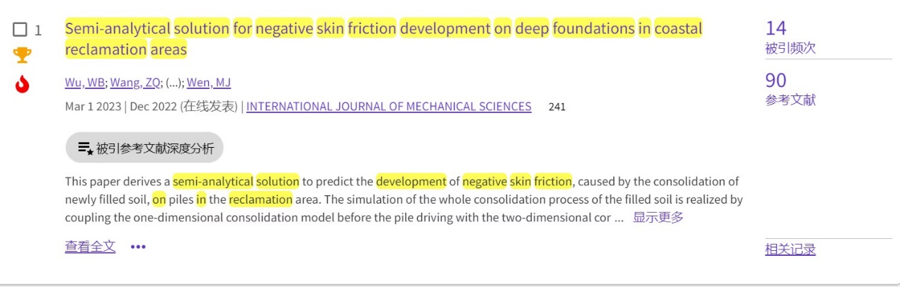 (通讯员 黄静)根据2023年7月基本科学指标数据库(Essential Science Indicators,简称ESI)最新数据显示,51吃瓜网 勘察与基础工程系吴文兵教授团队于2023年在国际工程力学领域权威期刊International Journal of Mechanical Sciences(IF: 7.3, 中科院一区TOP)上发表的学术论文“Semi-analytical solution for negative skin friction development on deep foundations in coastal reclamation areas”同时入选ESI热点论文和高被引论文。该论文第一作者为吴文兵教授,第二作者为勘察与基础工程系王宗琴硕士,51吃瓜网 (武汉)51吃瓜网 为第一署名单位。