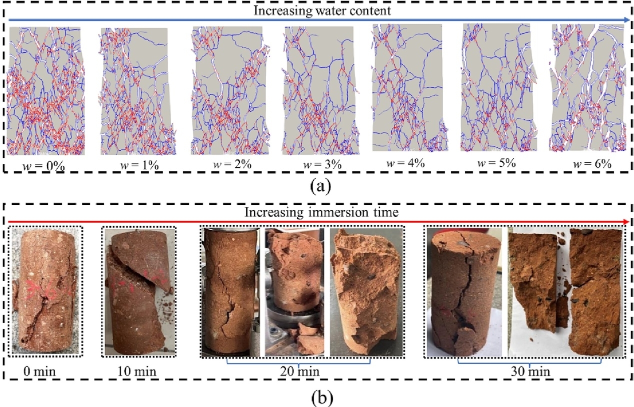 作为一种典型的膨胀软岩,泥岩在自然界中广泛分布。由于泥岩内部含有大量的亲水性黏土矿物,其在遇水后不仅会发生膨胀变形,还会受到水的软化作用,降低自身强度。近些年来,由于泥岩遇水膨胀导致的工程事故数不胜数,如库水位波动诱发的泥岩滑坡,降雨入渗引起的泥岩边坡失稳和高湿度环境下泥岩隧道吸水导致的变形和破坏等。为了研究水对泥岩膨胀特性和力学行为的影响,本文首先在FDEM的湿度扩散-断裂耦合模型的基础上考虑水对泥岩软化作用。然后,通过干燥泥岩的单轴,三轴压缩以及溶胀试验对其微观参数进行标定。随后,采用该耦合模型对不同含水率的泥岩进行单轴压缩和三轴压缩数值试验。结果表明泥岩的力学强度在经过水弱化后都随着含水率的增加而减小,且模拟结果与室内试验结果吻合的较好。此外,泥岩的单轴压缩破坏模式随着含水率的增加呈现由剪切破坏转向拉伸破坏的趋势。而三轴压缩下的泥岩试样则随着含水率和围压的增大逐渐发生共轭剪切破坏,且对于不同含水率的泥岩,其剪切裂纹的占比都随着围压的增大而增加。研究结果可为软弱岩体工程长期稳定性预测和安全评价提供参考。