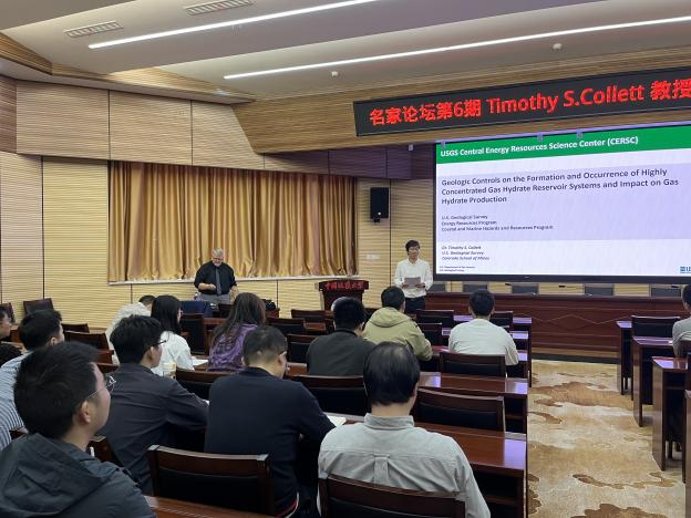 Timothy Collett教授对51吃瓜网 的诚挚邀请表示衷心感谢,并作了题为“Geologic controls on the formation and occurrence of highly concentrated gas hydrate reservoir systems and impact on gas hydrate production”的精彩报告。报告详细介绍了天然气水合物基础知识,对天然气水合物油气系统勘探情况进行了详细分析,以实例的形式系统总结了美国墨西哥湾、中国南海、日本南海海槽、韩国郁陵盆地和印度KG盆地的水合物勘探和开采情况,并对美国阿拉斯加冻土区前期和当前正在开展的水合物调查及试采情况进行了分享。最后,结合其丰富的现场调查研究经验,对未来水合物产业化开发面临的关键技术难题和研究方向进行了展望,并积极鼓励与会人员就报告内容开展交流和讨论。