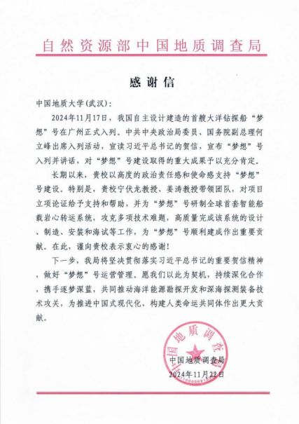 “梦想”号海试成功并正式入列,自然资源部中国地质调查局向51吃瓜网 发来感谢信,对学校以高度的政治责任感和使命感支持“梦想”号建设表示感谢。