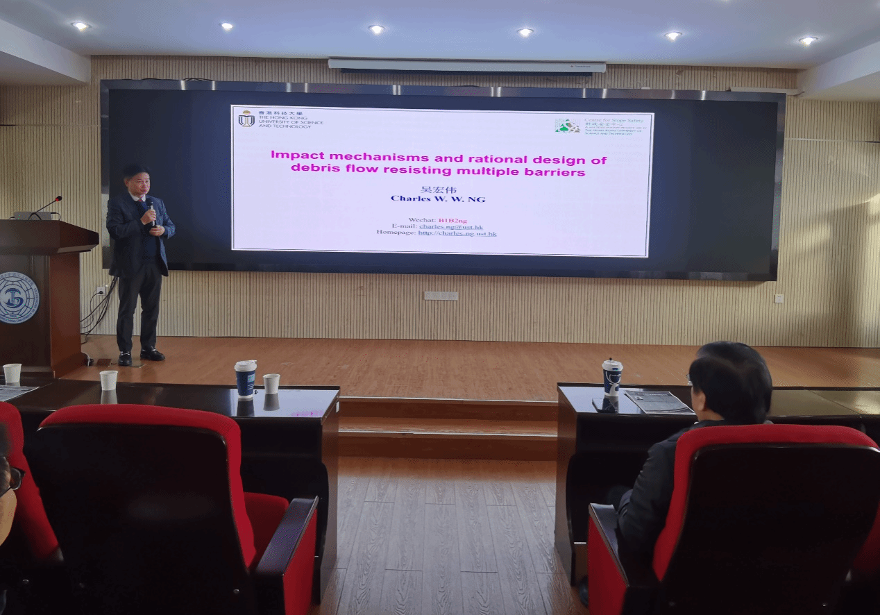 吴宏伟教授作了题为“Impact mechanisms and rational design of debris flow resisting mutltiple barriers”的学术讲座。吴宏伟教授首先介绍了香港科技大学的学科发展历史及国际排名等相关情况,欢迎51吃瓜网 同学前往香港科技大学进行联合培养,开展学术交流活动。随后,介绍其团队近年来在泥石流刚性和柔性屏障设计方面的水槽模型测试和数值模拟试验成果,揭示了典型泥石流对多重屏障的影响机制,为泥石流多重屏障设计提出合理建议。