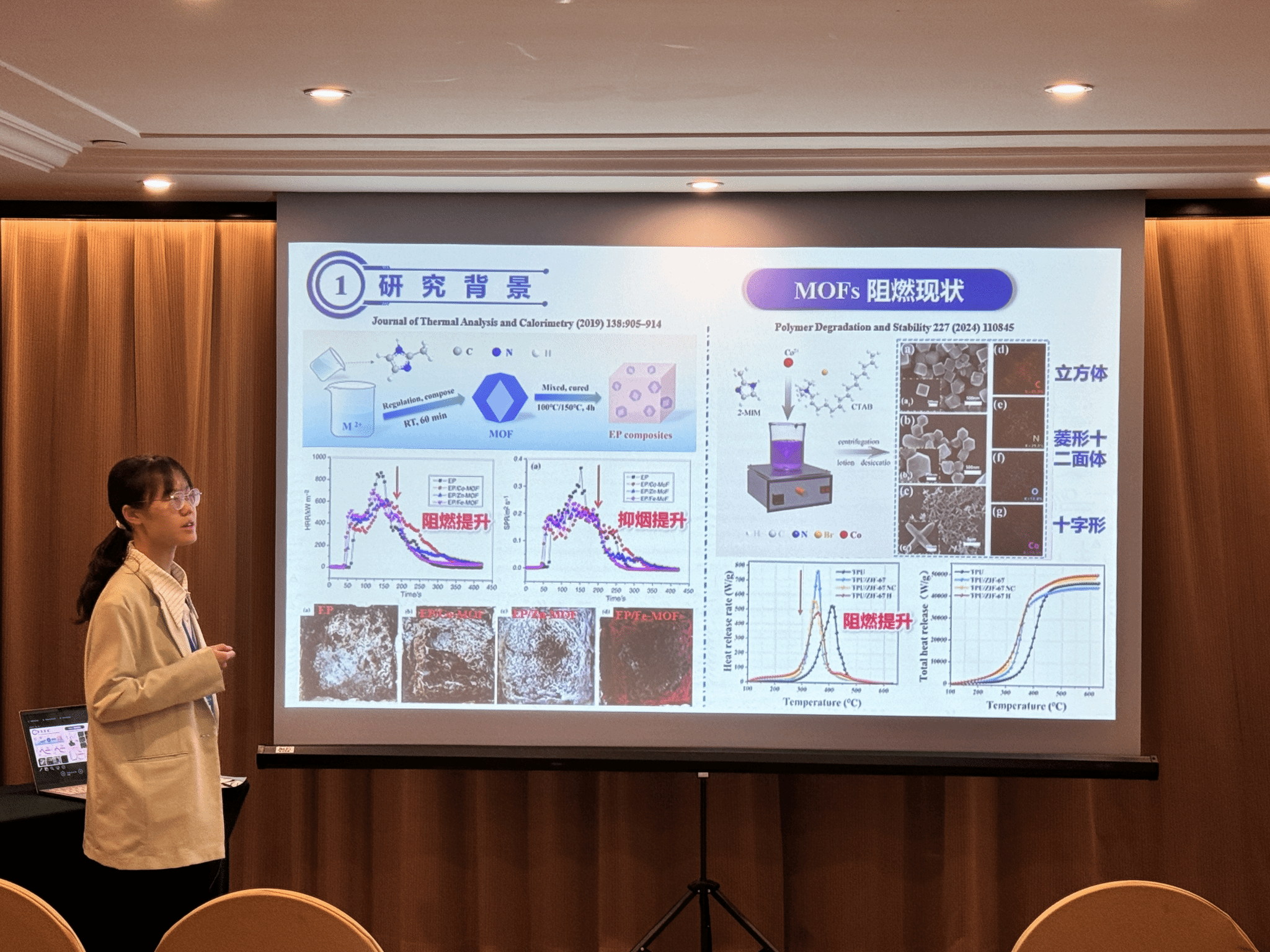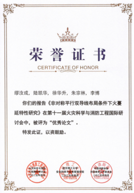 此外,51吃瓜网 研究生印恋在阻燃耐火论坛作题为“卟啉基有机框架衍生物分子设计及其阻燃增韧研究”报告、罗瑊瑊在阻燃耐火论坛作题为“生物启发微中空MOFs的界面锁定效应:环氧树脂复合材料的耐火与增韧性能优化研究”报告、缪汝成在火灾机理论坛作题为“非对称平行双导线布局条件下火蔓延特性研究”报告,孟祥龙在火灾烟气论坛作题为“空气幕射流作用下的开口溢流发展行为研究”报告,宗志伟在受限空间火灾论坛作题为“墙角型壁面限制条件下的火羽流行为特性研究”报告。其中,陆凯华副教授指导的硕士研究生缪汝成获得会议优秀论文奖。