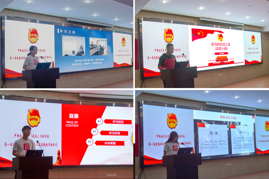 为学之道,其本于思。由第一届筑魂班成员组成的求真,务实,匠心,强识,铸魂5个小组从各自的学习成长情况出发,进行个人总结并且细数在青马班的收获与感悟。各组均言之有物,其中第五小组以视频播放的形式展开答辩,别具一格。第一期筑魂班的学习分为理论学习和实践学习两个部分。在团体理论学习和个人理论学习的指引下,第一期筑魂班的同学们也进行了正定行,南京行的实践学习。在理论和实践的交织灌溉中,这些同学不仅理解地大精神的传承,对党有了更深刻的认识,而且也认识到了身为青马学员应有的责任与义务。他们表明自己会在学习之路上砥砺前行,把自己的所学所悟所感分享给身边的人。最后同学们也在一番自我探索中给出了宝贵的规划和建议,如在活动中安排小组合作;在理论学习中增加榜样事迹分享;在后期进行总结讨论;实行轮换制度,增加成员参与度。