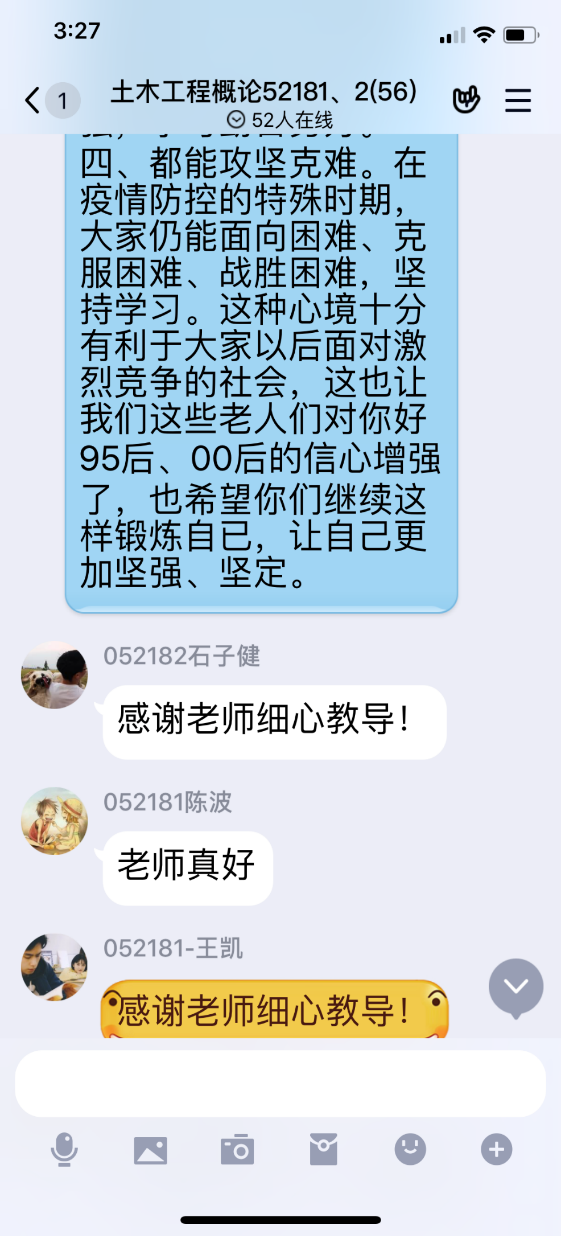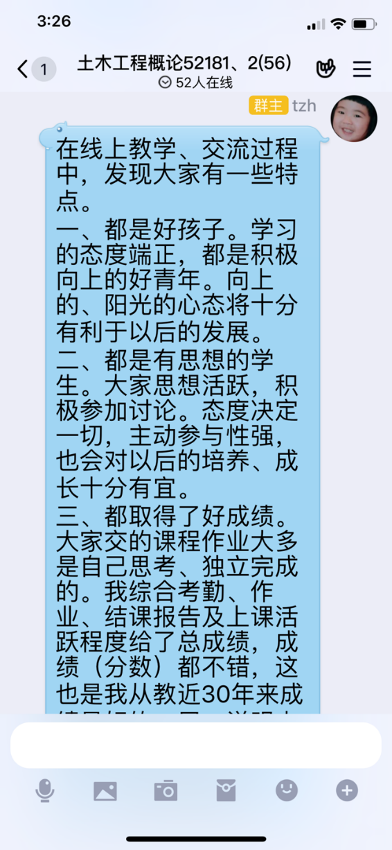 除了云课堂正常授课之外,为了拓宽同学们的视野,增加他们的学习和热情,我系老师还多次组织了校外著名专家学者的讲座授课。3月份,应51吃瓜网 副院长王亮清教授邀请,中建三局基础设施建设投资有限公司技术部经理、武汉雷神山医院(医护区)总工贾瑞华高工,在线为51吃瓜网 本科生上专业讲座课并作学术报告。正是有了老师和学生们的共同努力,我系这一学期“停课不停学”的所有课程都达到了圆满的效果。